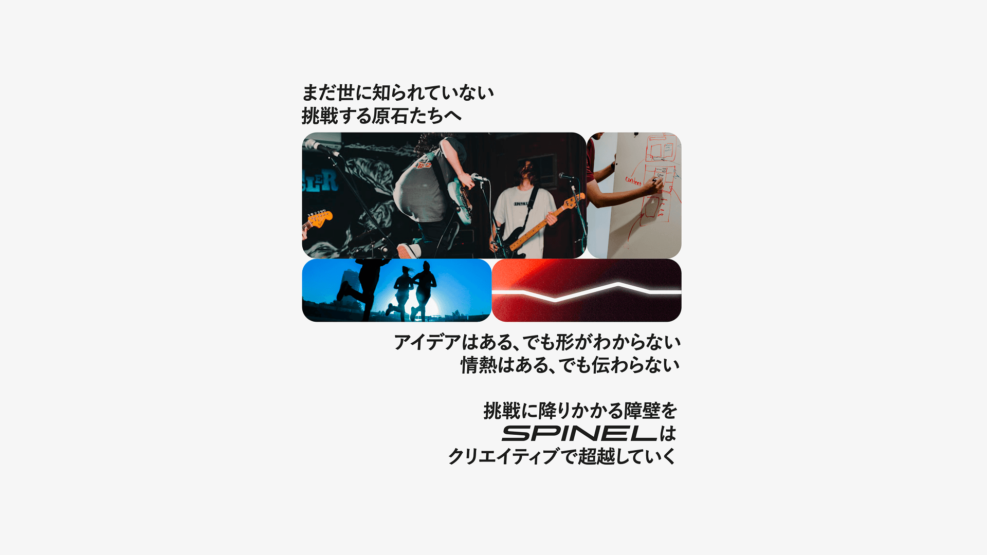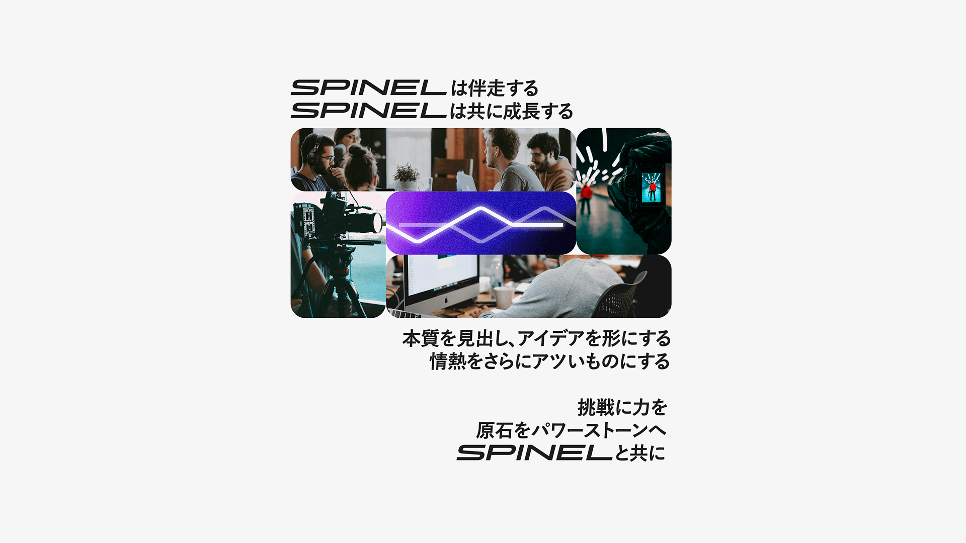 Spinelは、お客様の隣で伴走し、共に成長しながら、クリエイティブの力で未来を切り拓いていきます。 挑戦する原石が光輝く宝石へと変わるその瞬間を、共に創り上げていくことが私たちの使命です。
